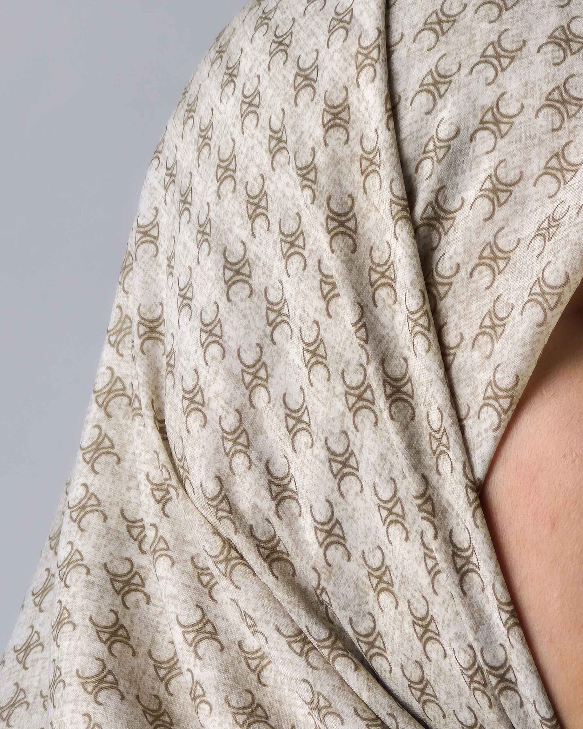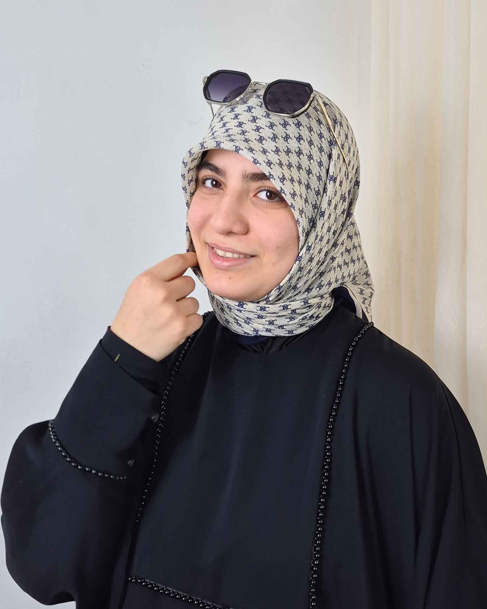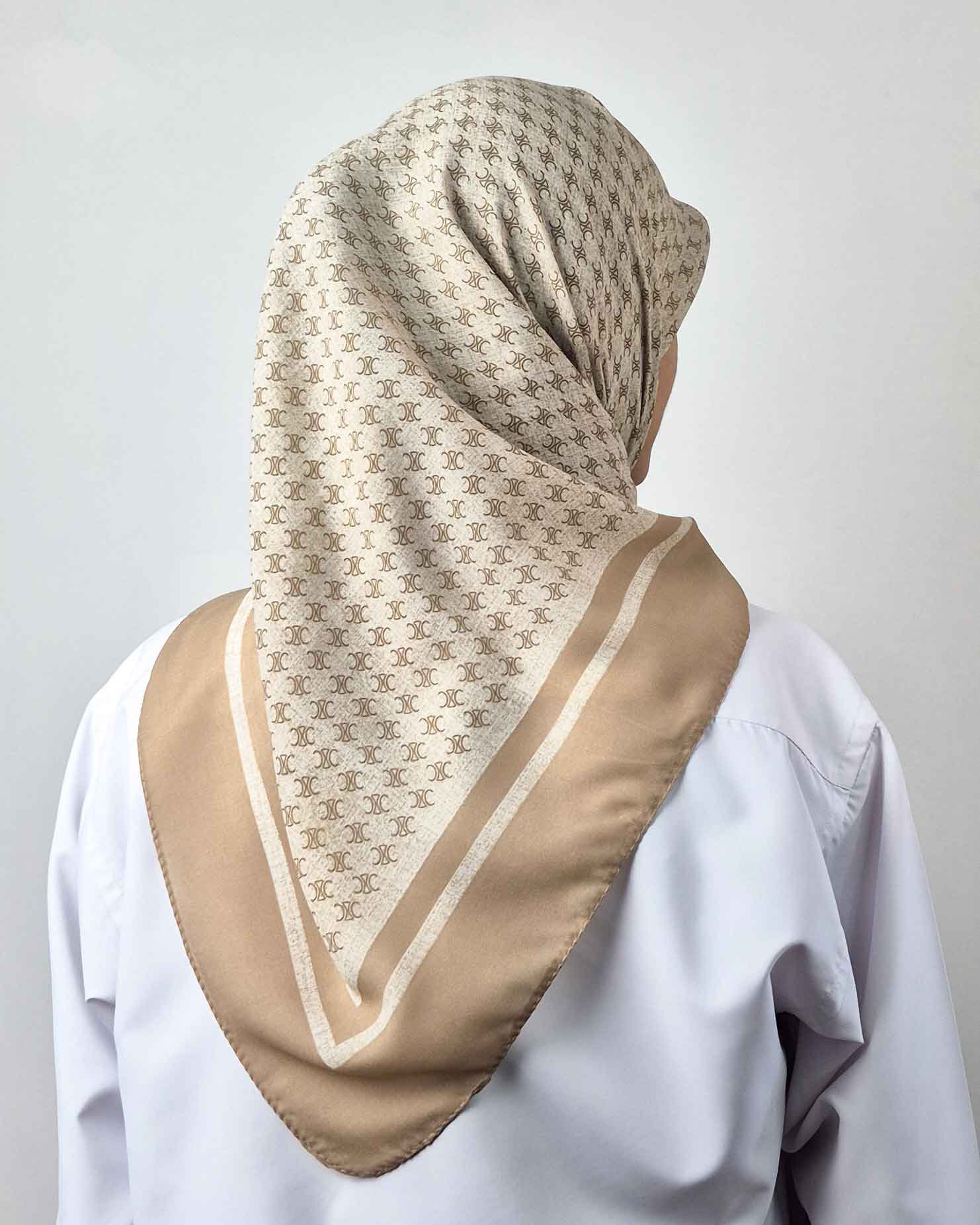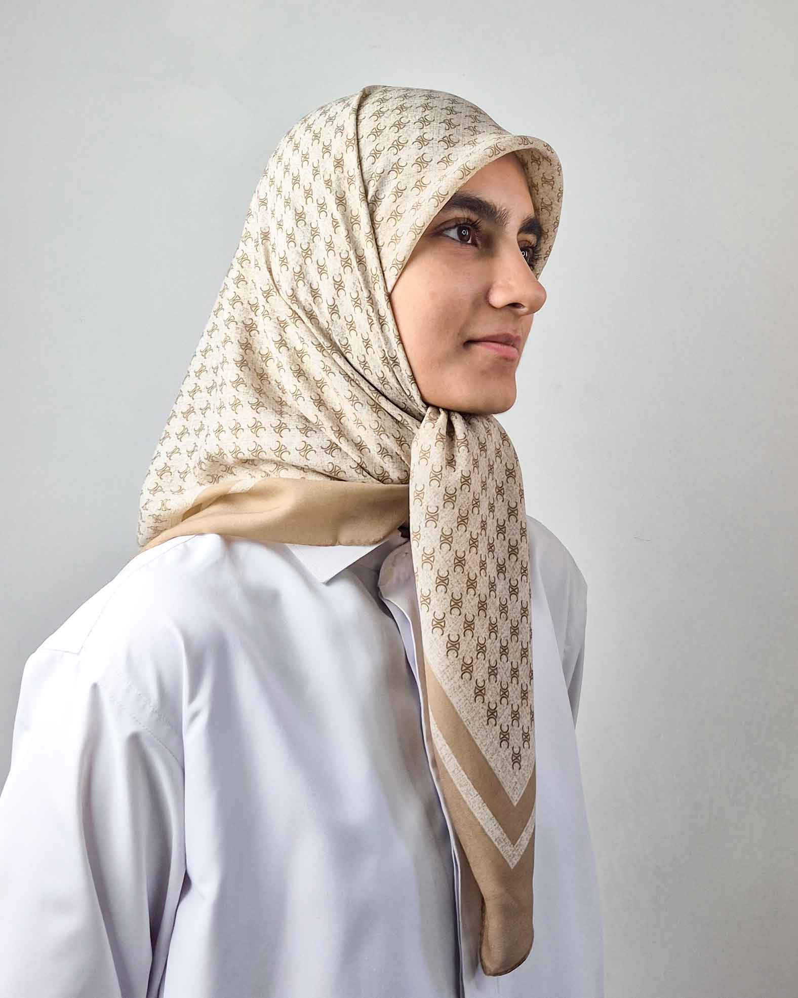 روسری نخی سیا اسکارف با طرح لوگویی مینیمال و رنگ بژ، پارچه نرم و سبک و قواره ۱۰۰، انتخابی شیک و لطیف برای استایل روزمره و رسمی بانوان است.
