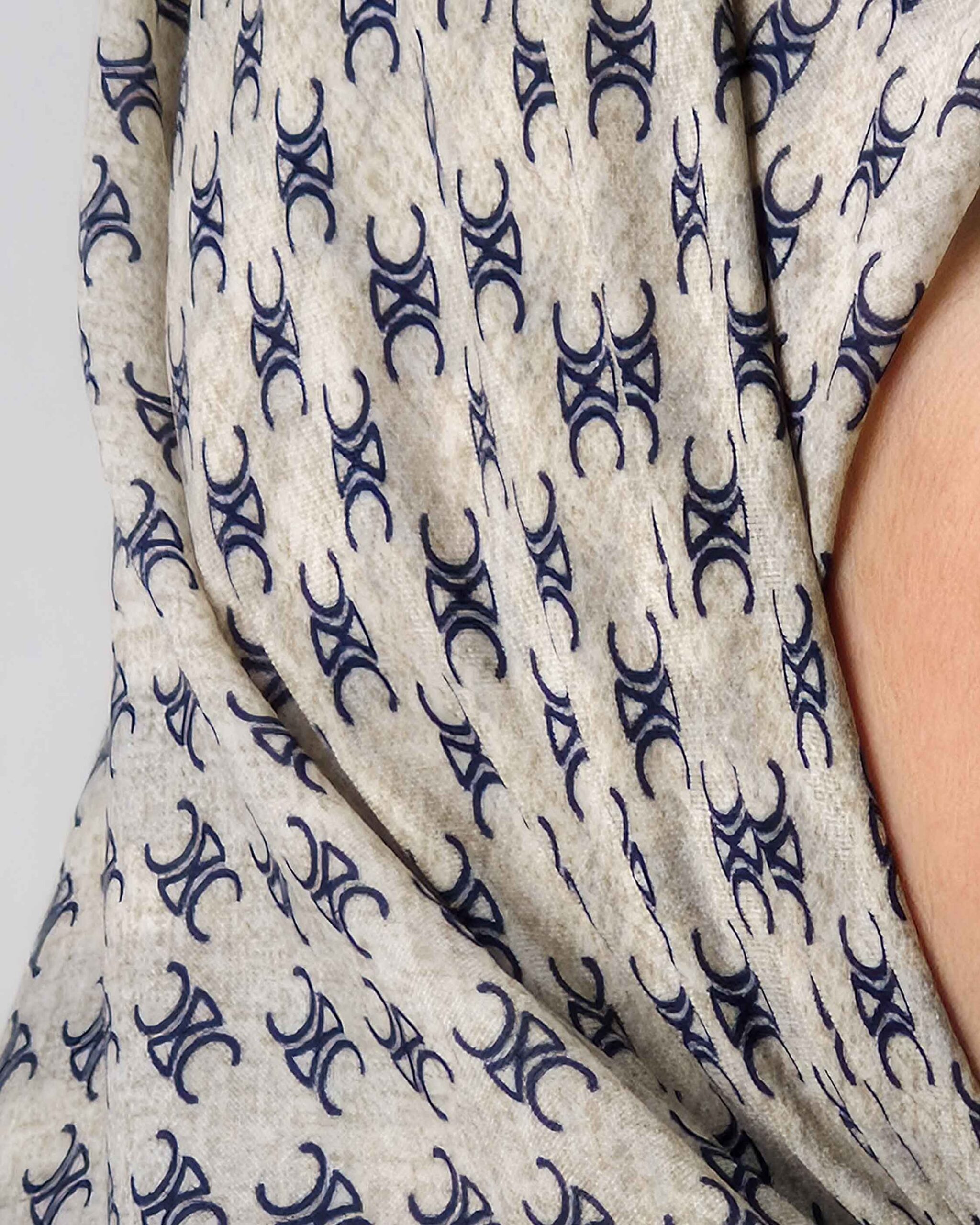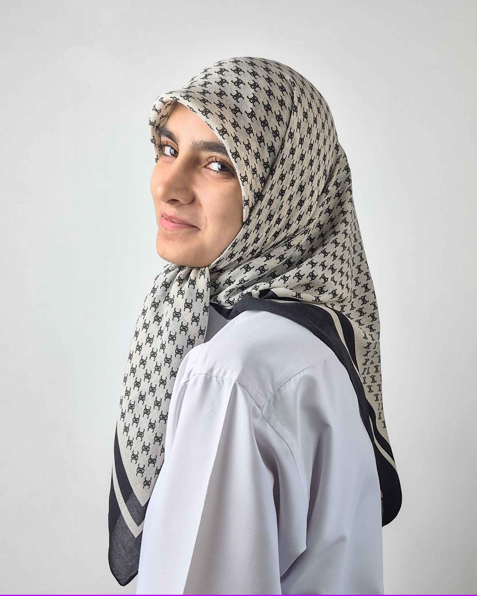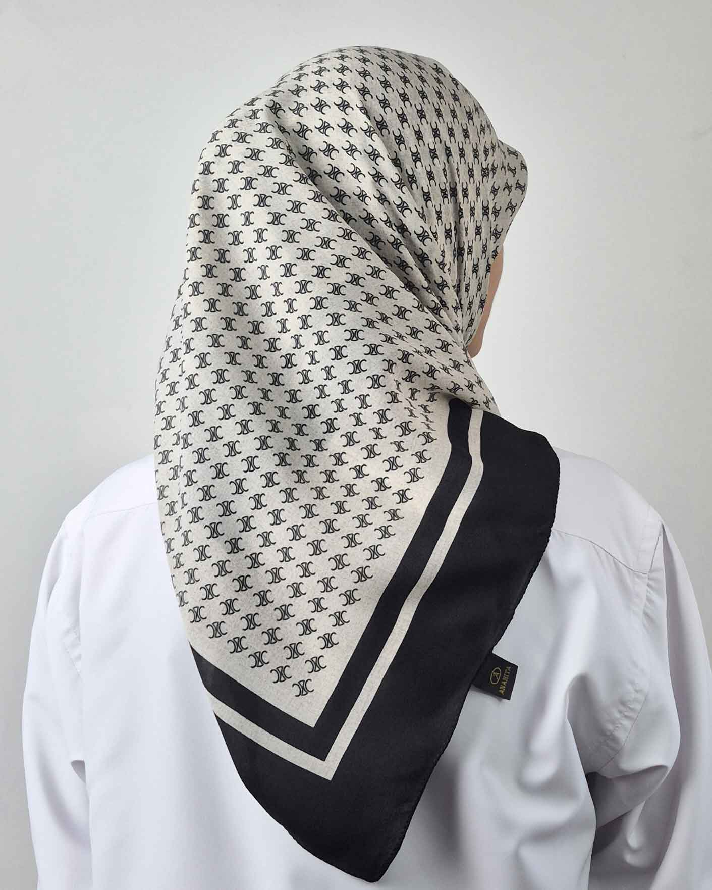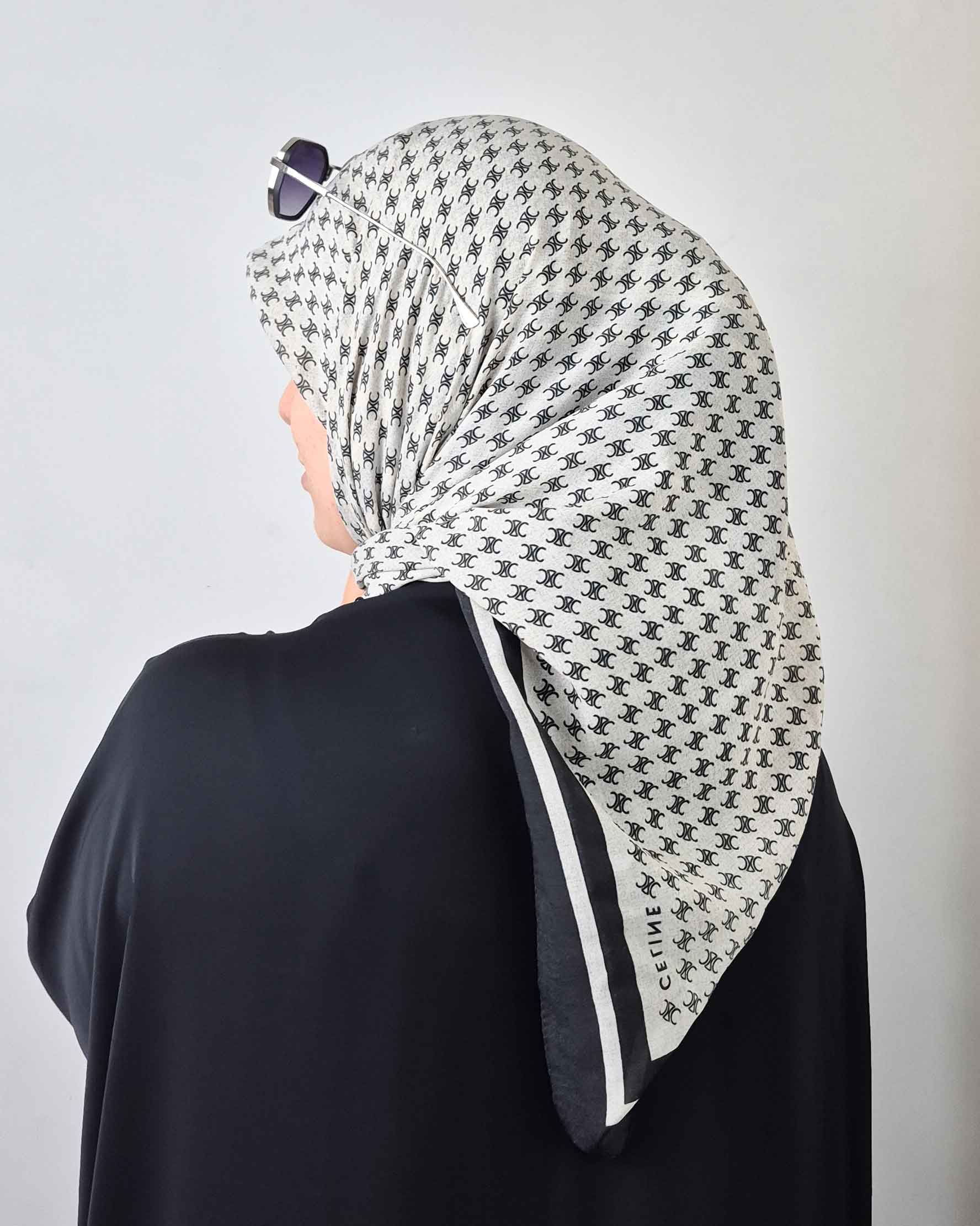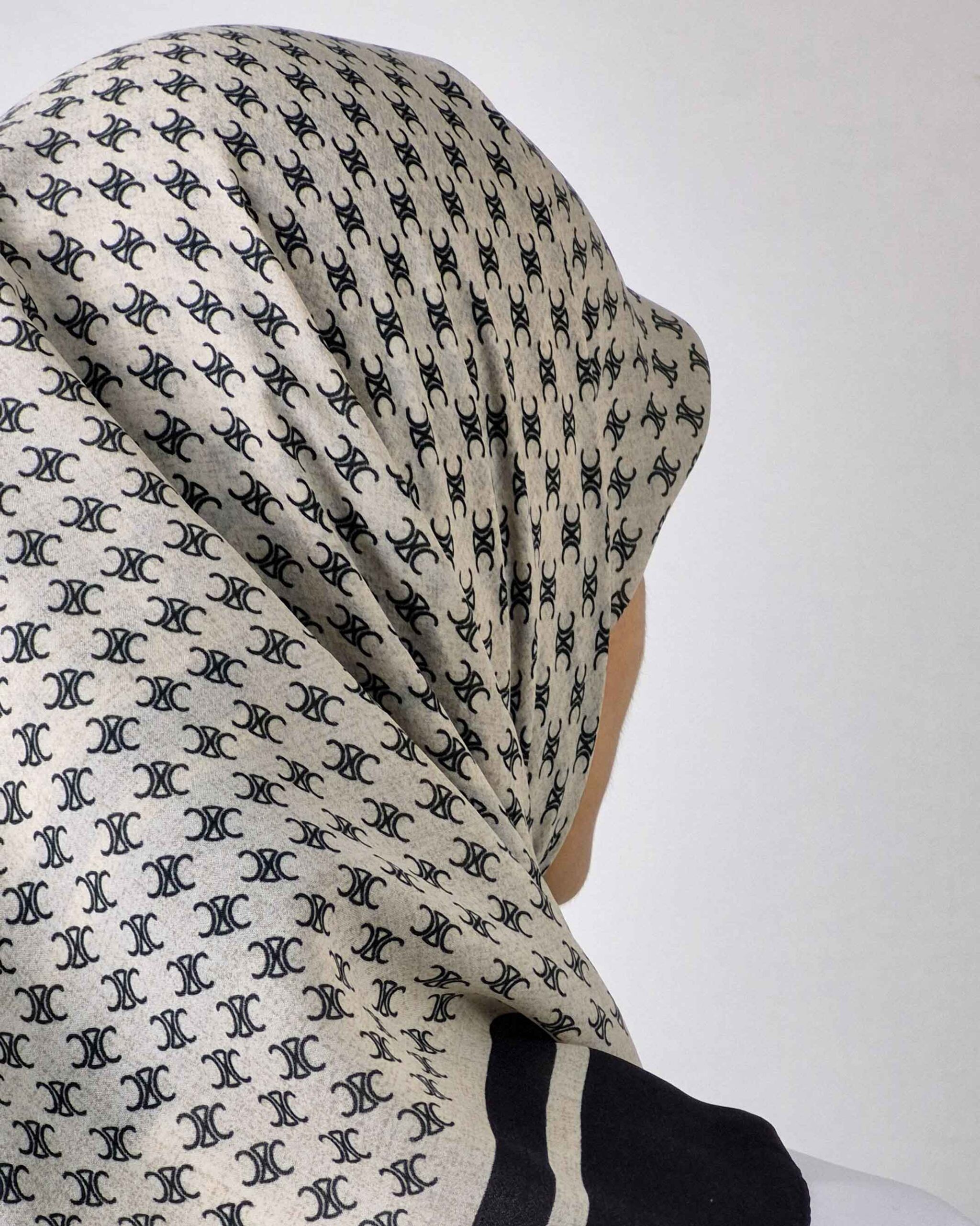 روسری سیا اسکارف با طرح لوگویی منظم و بافت پارچهی لطیف، انتخابی بینظیر برای استایل روزمرهی شیک و مینیماله.