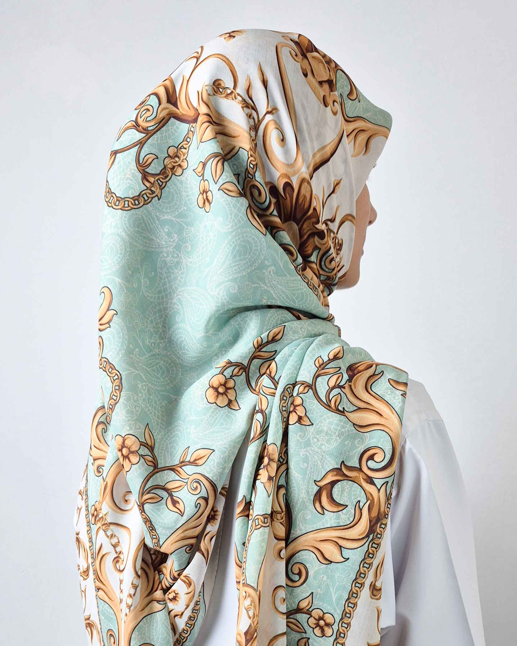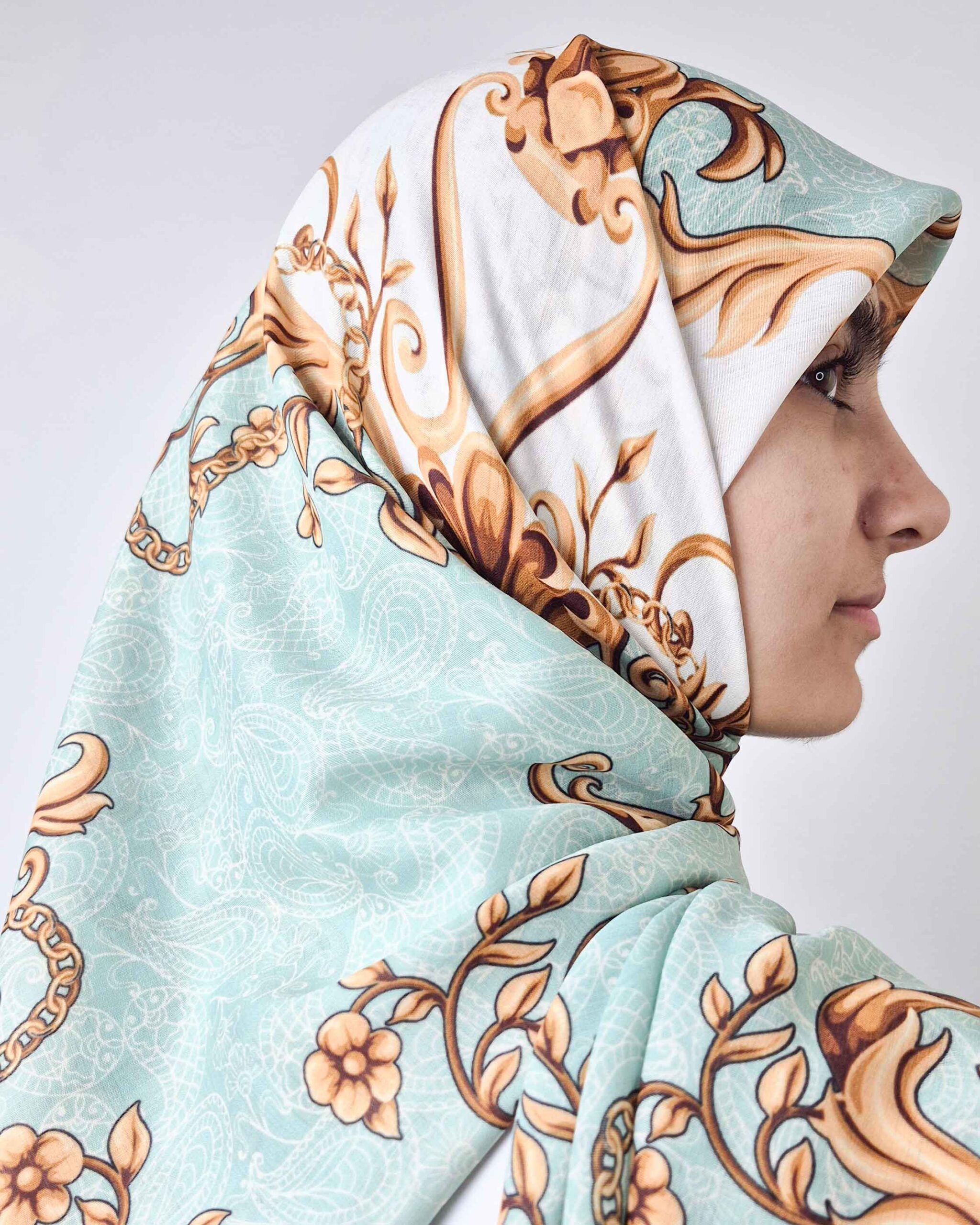 روسری طرح تاج با ترکیب رنگ سبز کم رنگ و جزئیات طلایی، حس شکوه و اصالت را به زیباترین شکل ممکن به نمایش میگذارد.