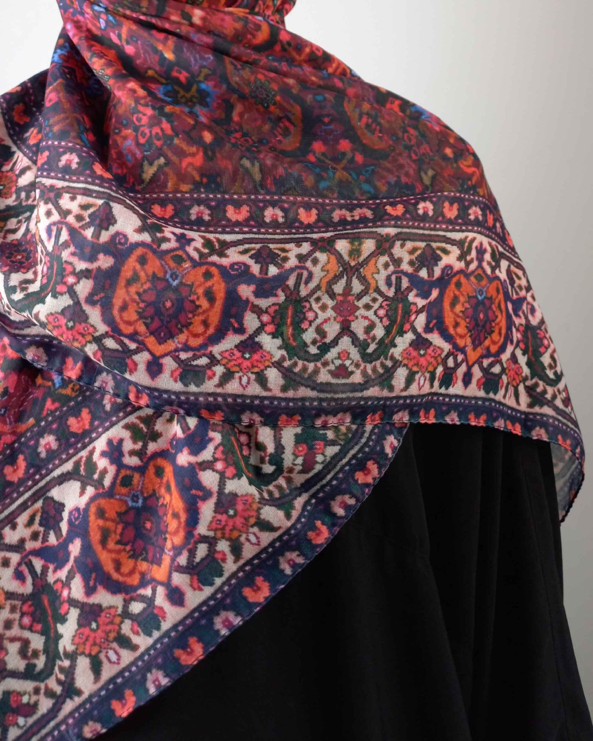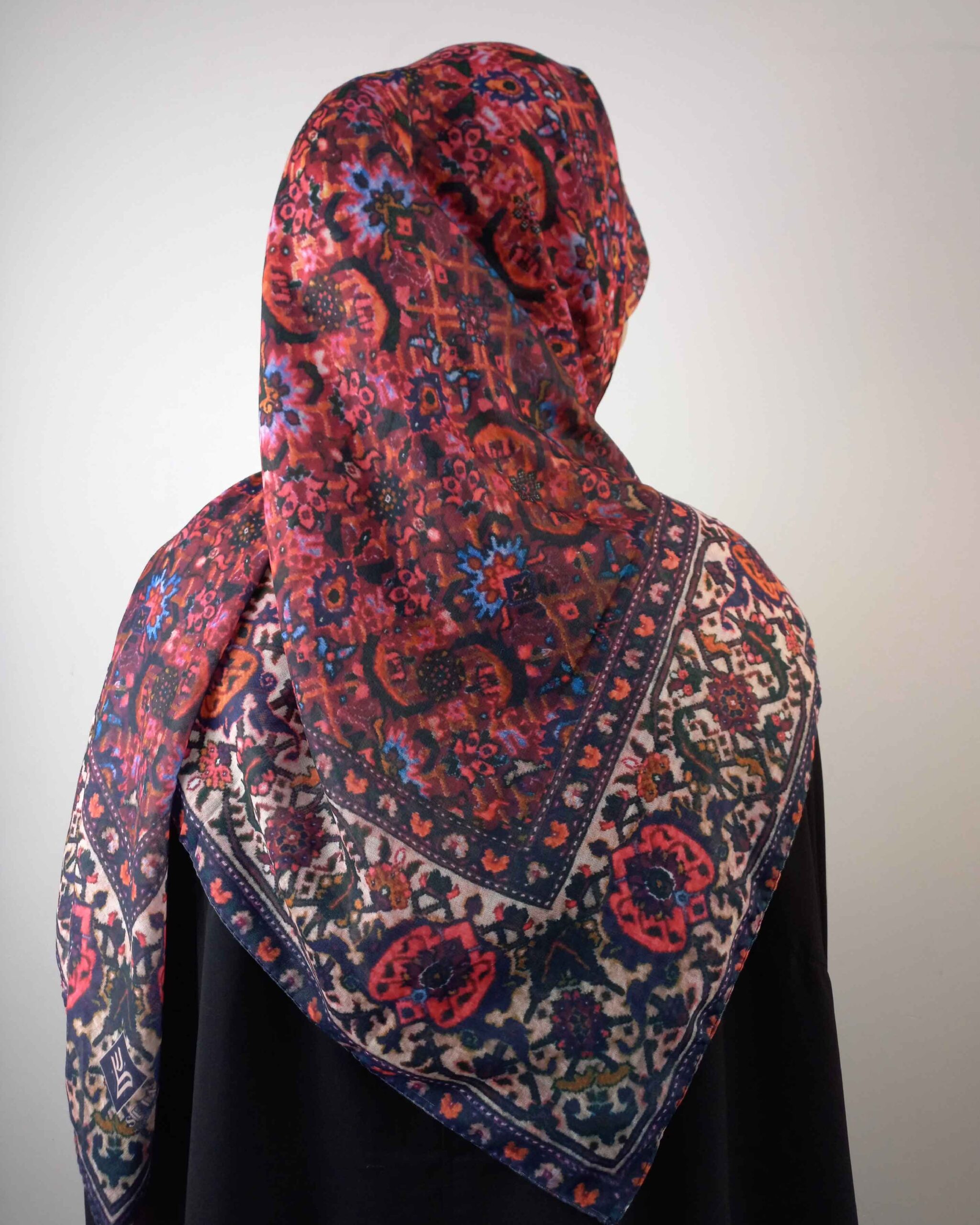 اگر به دنبال ظرافتی جسورانهای، این روسری با نقشهای الهامگرفته از فرش ایرانی و طیف عمیق رنگهای قرمز و لاکی،